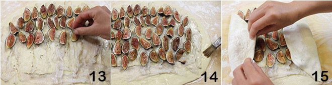 puis disposez les figues 13. Badigeonnez les bords de la pâte avec de l'eau 14 et commencez à refermer la pâte : repliez le bord droit vers l'intérieur, puis le gauche 15
