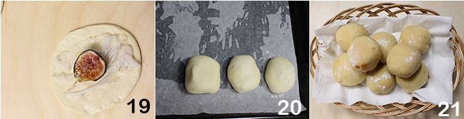Une alternative savoureuse pourrait être de préparer des petits pains individuels. Formez avec la pâte à pain des disques d'environ 9 cm de diamètre, puis disposez sur chacun quelques tranches de lard et une demi-figue 19. Badigeonnez les bords de chaque disque avec de l'eau et procédez à les fermer en suivant les indications de la recette. Disposez les petits pains sur une plaque de cuisson couverte de papier sulfurisé 20 et enfournez à 200° pendant 35-40 minutes 21.