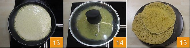 Dès que des bulles commencent à apparaître à la surface 13, couvrez avec un couvercle et terminez la cuisson 14 : cela prendra environ 2 minutes, vous remarquerez que la cuisson est terminée car le pain change de couleur 15. Une fois cuit, couvrez le pain très bien avec du film plastique, pour éviter qu'il ne sèche. Voilà, le pain injera est prêt !
