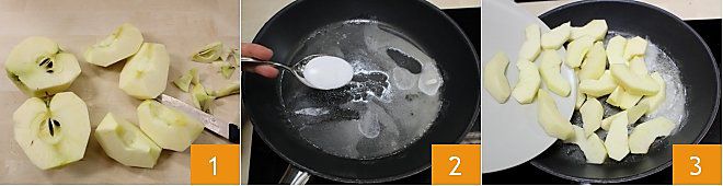 Pour préparer le pain perdu avec des pommes caramélisées, commencez par préparer ces dernières : épluchez les pommes lavées, retirez le trognon et coupez-les en tranches pas trop fines 1. Mettez le beurre dans une poêle, faites-le fondre et ajoutez le sucre 2, puis disposez les tranches de pomme 3.