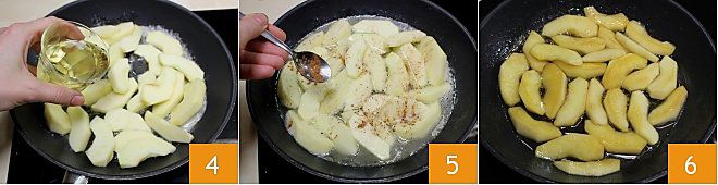 Arrosez les pommes avec le vin 4, ajoutez la cannelle 5 et faites-les cuire (sans les toucher avec une cuillère en bois pour ne pas les casser) à feu très doux, jusqu'à ce qu'elles soient cuites et caramélisées 6.