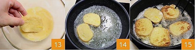 Trempez les tranches de pain des deux côtés dans la pâte 13 et mettez-les directement à frire dans la poêle 14. Faites-les bien dorer des deux côtés, en les retournant avec une pince 15 et une fois prêtes, placez-les sur du papier absorbant de cuisine.