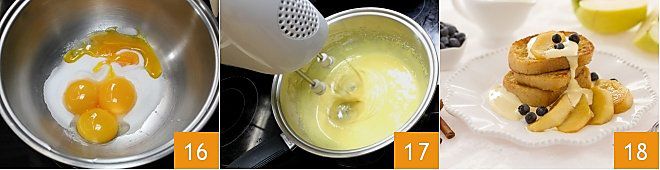 Entre-temps, préparez le sabayon (cliquez ici pour plus d'indications) en battant les jaunes avec le sucre dans une casserole placée au bain-marie avec les fouets d'un batteur (16-17) : ajoutez la cannelle et le vin, une cuillère à la fois, en continuant de battre jusqu'à absorption complète. Quand le sabayon est prêt, vous pouvez dresser le tout : placez trois tranches de pain l'une sur l'autre dans une assiette de service, disposez quelques tranches de pomme caramélisée à côté du pain et terminez avec l'ajout de deux cuillères de sabayon 18 : voilà votre pain perdu avec des pommes caramélisées prêt!