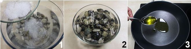 Pour préparer les palourdes à la pêcheur, rincez les vraies palourdes, écartez celles avec les coquilles cassées et mettez-les dans un bol d'eau avec une poignée de gros sel 1 pour les purger. Remuez les palourdes entre vos mains pour qu'elles éliminent le plus de sable possible et laissez-les tremper pendant 1-2 heures. Pendant ce temps, changez l'eau et le gros sel et répétez l'opération jusqu'à ce que l'eau dans le bol soit complètement claire et propre 2. Pour raccourcir le temps, vous pouvez également rincer les palourdes sous l'eau courante et les battre sur une planche en bois, côté coupé vers le bas : si la palourde est propre, elle peut être cuite, si du sable s'échappe, la palourde est à écarter. Mettez dans une poêle 4 cuillères à soupe d'huile d'olive extra vierge 3