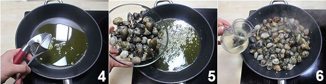 et faites revenir les gousses d'ail, épluchées et écrasées 4. Égouttez les palourdes et ajoutez-les dans la poêle 5, arrosez de vin 6 et poursuivez la cuisson, à feu moyen, pendant quelques minutes jusqu'à ce que le vin soit complètement évaporé.