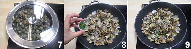 Couvrez avec le couvercle et laissez cuire pendant encore 2 minutes 7. Quand toutes les palourdes seront bien ouvertes, ajoutez une pincée de persil haché 8, faites-les sauter quelques fois et vos palourdes à la pêcheur 9 seront prêtes à être servies !