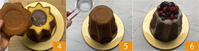 Recouvrez le pandoro avec le chapeau 4, puis saupoudrez la surface de sucre glace 5 et décorez avec les fruits des bois 6. Laissez le pandoro farci de NUTELLA glacé à température ambiante pendant environ 10 minutes avant de le servir et de le couper !