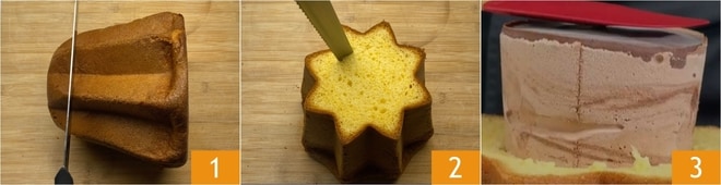 Pour préparer le pandoro farci de NUTELLA Glacé, commencez par couper la partie supérieure du pandoro à environ 3-4 cm de hauteur 1. À l'aide de la lame d'un couteau long et dentelé, creusez l'intérieur du pandoro pour créer une cavité d'à peu près la même taille que le bac de NUTELLA Glacé 2. Transférez le pandoro sur le plat de service, puis retirez le papier de la glace et insérez-la à l'intérieur de la cavité 3.