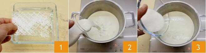 Pour préparer la panna cotta au coco avec coulis de framboises, commencez par tremper la gélatine en feuilles dans un récipient d'eau froide. Laissez-la ramollir complètement pendant au moins 10 minutes 1 et entre-temps commencez à préparer la panna cotta. Dans une petite casserole, faites chauffer à feu doux, sans faire bouillir, la crème ; ajoutez ensuite le lait de coco 2 et le sucre 3, en mélangeant bien avec les fouets.