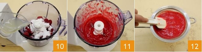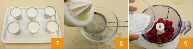 Une fois cette opération terminée 7, mettez la panna cotta au coco au réfrigérateur pour qu'elle se raffermisse pendant au moins 3 heures et pendant ce temps, préparez le coulis de framboises, c'est-à-dire la sauce d'accompagnement ; pressez un citron et filtrez le jus avec un tamis 8, puis dans un mixeur, mettez les framboises (en en réservant 6 pour la décoration finale) et le sucre glace tamisé 9.