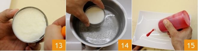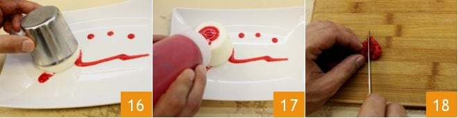 Après 3 heures, lorsque la panna cotta sera ferme, insérez à moitié la lame d'un petit couteau dans le moule et parcourez tout le périmètre pour détacher la panna cotta des bords 13. Ensuite, plongez chaque moule quelques secondes dans l'eau bouillante en vous arrêtant à 2-3 mm du bord 14. Après avoir complété cette étape, décorez l'assiette de présentation avec le coulis de framboises pour créer la base sur laquelle vous placerez ensuite la panna cotta, en utilisant un distributeur 15 ou une poche à douille.