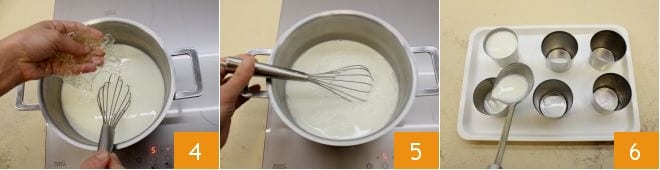 Après 10 minutes, pressez bien la gélatine en feuilles avec vos mains 4 et ajoutez-la au mélange, en mélangeant bien jusqu'à ce qu'elle soit complètement dissoute 5 (s'il y a des grumeaux, passez le tout à travers un tamis fin). À ce stade, éteignez le feu et préparez 6 moules d'une capacité de 150 ml sur un plateau, en mouillant l'intérieur avec de l'eau : cette opération vous aidera à démouler plus facilement la panna cotta une fois solidifiée. Ensuite, avec une louche, versez la panna cotta au coco que vous avez obtenue en remplissant les moules jusqu'au bord 6.