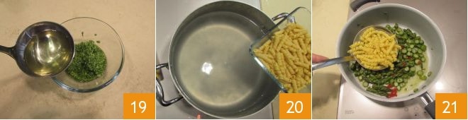 Diluez le pesto de roquette avec l'eau de cuisson des asperges 19 pour le rendre plus crémeux. À ce stade, faites cuire les pâtes dans de l'eau bouillante salée 20 et égouttez-les al dente. Ajoutez les pâtes dans la poêle avec les asperges 21 et faites sauter pendant une minute.