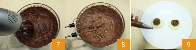 Une fois que la crème sera bien froide, montez le mélange avec un batteur électrique 7, jusqu'à ce qu'il devienne crémeux et dense 8 (cela prendra au moins 10 minutes). Maintenant que votre crème ganache est prête, versez-la dans une poche à douille munie d'une douille étoilée et garnissez la surface des petits gâteaux au chocolat blanc avec une rosette de crème 9.