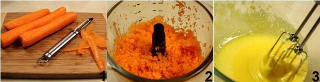 Pour préparer les petits gâteaux à la carotte type "camille", commencez par bien laver et éplucher les carottes 1, puis hachez-les finement dans un mixeur 2. Dans un grand bol, battez les œufs avec le sucre 3.