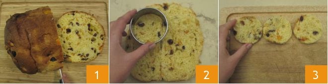 Pour réaliser les petits gâteaux de panettone et Nutella®, commencez par couper le panettone en tranches de 1 cm d'épaisseur 1. À partir des tranches, découpez 12 disques à l'aide d'un emporte-pièce de 6 cm de diamètre (2-3).
