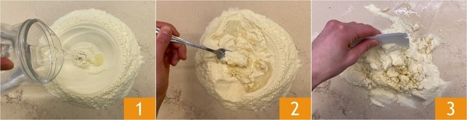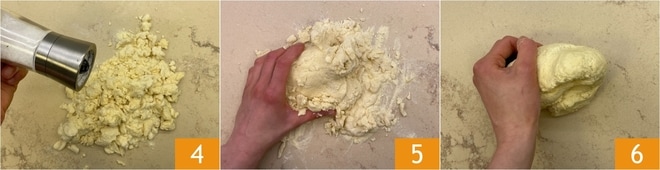 Ajoutez une pincée de sel 4 et travaillez à la main 5 jusqu'à obtenir une pâte élastique et homogène 6. Enveloppez-la dans du film alimentaire et laissez reposer pendant 30 minutes au réfrigérateur.