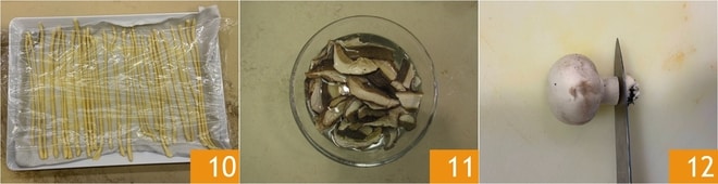 Déposez les pici sur un plateau tapissé d'un torchon saupoudré de semoule et couvrez de film alimentaire 10. Passez aux champignons : faites tremper les cèpes séchés pour les réhydrater 11, puis nettoyez les champignons frais en éliminant la partie terreuse de la base 12.