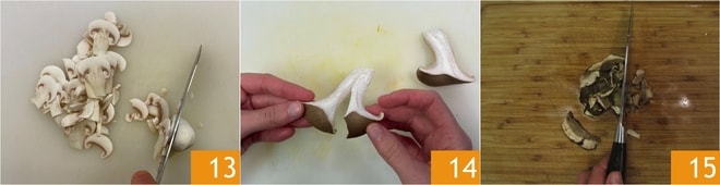 Coupez les portobellos et les champignons de Paris en fines tranches 13, déchirez les pleurotes avec les mains 14 et laissez les champignons pieds-de-mouton entiers. Égouttez les cèpes séchés et hachez-les finement avec un couteau 15.