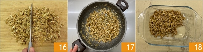 Occupez-vous maintenant des noix : hachez grossièrement les cerneaux 16 et toastez-les quelques minutes dans une poêle avec un filet d'huile, ainsi ils libéreront leurs huiles naturelles 17. Lorsque vous commencez à sentir leur parfum, éteignez le feu et transférez les noix toastées dans un bol. Mettez de côté 18.