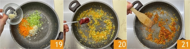 Dans la même poêle, ajoutez l'huile et les légumes pour le soffritto que vous aurez préalablement hachés, à savoir l'oignon, la carotte, le céleri et l'ail 19. Faites fondre le soffritto à feu doux, puis ajoutez le concentré de tomate 20 et mélangez bien pour l'incorporer 21.