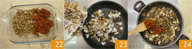 Transférez le soffritto dans le bol avec les noix et mettez de côté 22. Toujours dans la même poêle, versez les champignons avec un filet d'huile 23, salez, poivrez et faites cuire à feu vif pendant 8-10 minutes, en remuant souvent. Lorsque les champignons sont dorés, ajoutez les cèpes séchés hachés et le soffritto 24.