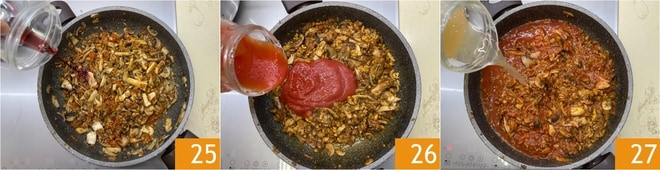 Déglacez avec le vin rouge 25 et laissez évaporer complètement la partie alcoolique, puis ajoutez les noix toastées et la sauce tomate 26, en rinçant le pichet avec un peu d'eau. Versez également le bouillon de légumes chaud 27.