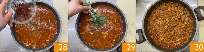 Enfin, ajoutez les tomates séchées hachées 28 et un bouquet de fines herbes fraîches que vous aurez attachées ensemble avec une ficelle 29. Laissez cuire doucement pendant 2 heures. Lorsque le ragoût est prêt 30, portez à ébullition une casserole d'eau salée pour les pici.