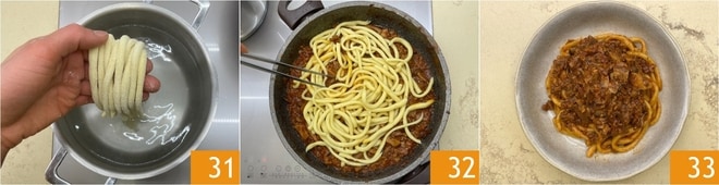 Faites cuire les pici pendant 6-7 minutes 31, puis égouttez-les dans la poêle avec la sauce et mélangez pour incorporer le tout 32. Vos pici avec ragoût de champignons et noix sont prêts à être dégustés 33 !