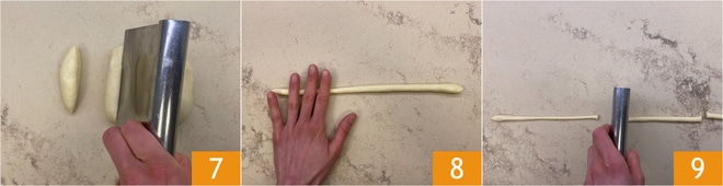 Après le temps de repos de la pâte, divisez-la en petites portions 7 et formez de longs et fins cordons 8. Coupez les cordons pour obtenir des pici d'environ la longueur des spaghettis 9.