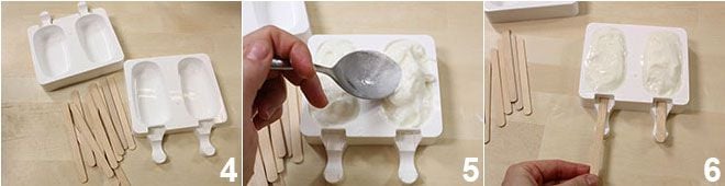 Maintenant, préparez tout le nécessaire pour faire votre pingouin : vous aurez besoin de moules en silicone et de bâtonnets de glace 4. Remplissez les moules avec la glace 5, nivelez bien et tapotez un peu le moule pour éviter la formation de bulles puis insérez les bâtonnets 6. Laissez durcir les glaces toute la nuit au congélateur.