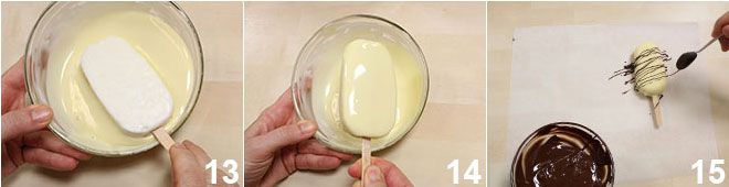 Après ce temps, faites fondre le chocolat noir et le chocolat blanc au bain-marie ou au micro-ondes (7-8) et laissez-le refroidir à température ambiante. Sortez du congélateur les glaces avec le bâtonnet et démoulez-les 9.