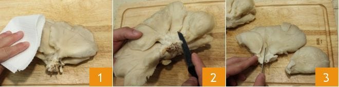 Pour réaliser les pleurotes grillés, commencez par nettoyer les champignons : avec un chiffon de cuisine, nettoyez la surface des chapeaux et le pied pour éliminer la terre 1, puis avec un petit couteau, séparez les pieds du pied central (2-3) et si nécessaire, repassez le chiffon sur les chapeaux et les lamelles internes pour éliminer toute trace de terre. Réservez les chapeaux entiers pour la cuisson.