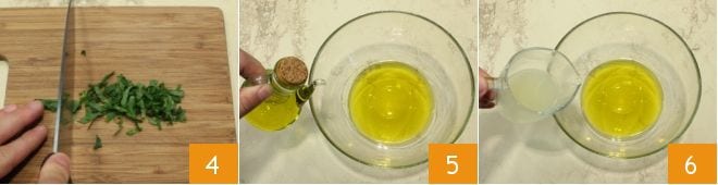 Préparez maintenant l'émulsion pour assaisonner les pleurotes grillés : émincez finement les feuilles de menthe 4, puis versez dans un bol l'huile d'olive 5, le jus de citron 6,