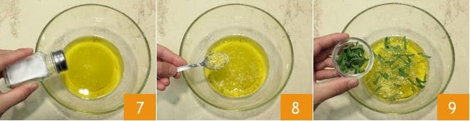 une pincée de sel 7, une cuillère à café de vinaigre de cidre et une cuillère à café de zeste de citron 8, ajoutez enfin les feuilles de menthe hachées 9.
