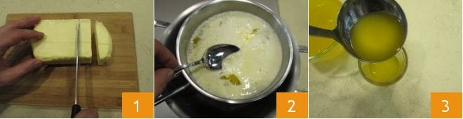 Pour préparer la plie avec sauce hollandaise, commencez par la sauce : d'abord, faites du beurre clarifié ; coupez le beurre 1, laissez-le fondre au bain-marie en faisant attention à l'écumer 2 et, une fois dépuré de la caséine, vous pouvez le transvaser 3.