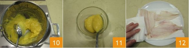 En continuant à mélanger, vous verrez que peu à peu votre sauce commencera à changer de couleur 10 devenant plus claire, de même que sa consistance changera, devenant plus ferme. Faites cuire environ 5 minutes à feu doux, en mélangeant toujours, et lorsqu'elle sera prête, mettez-la de côté dans un petit bol 11. Maintenant, occupez-vous de la préparation de la plie : séchez les filets de plie avec du papier absorbant 12