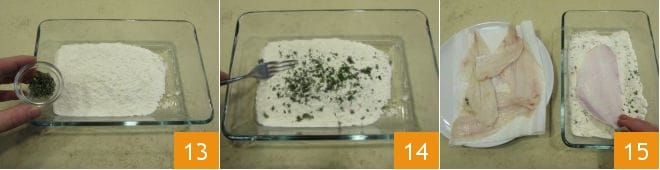 mettez la farine dans un plat, ajoutez le thym émietté 13, et mélangez avec une fourchette pour qu'il se répartisse de manière uniforme 14. Ensuite, farinez bien les filets de plie des deux côtés 15.