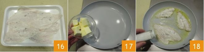 Une fois tous les filets farinés 16, faites chauffer le beurre dans une poêle antiadhésive 17, puis déposez-y délicatement les filets 18, et ajustez le sel.