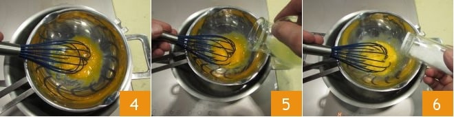 Entre-temps, préparez la sauce : il est très important que la cuisson soit au bain-marie, alors souvenez-vous que l'eau ne doit pas toucher le petit récipient et ne doit jamais atteindre l'ébullition. Versez les jaunes d'œufs dans le petit récipient et cassez-les avec un fouet 4, mélangez et ajoutez le jus de citron 5, le sel 6,