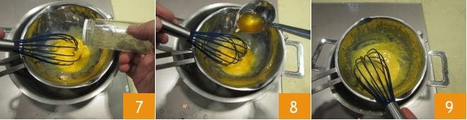 le poivre blanc 7 puis ajoutez le beurre clarifié en filet 8, et continuez à battre avec le fouet 9.