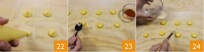 Versez la farce de courge et pecorino de fossa que vous avez mixée dans une poche à douille et garnissez les petits carrés de pâte aux œufs que vous avez découpés 22. Ensuite, ajoutez l'amer aux herbes aromatisé au citron et à l'aide d'une petite cuillère, déposez-en une goutte sur chaque pochette 23. Badigeonnez les petits carrés de pâte aux œufs avec de l'eau pour favoriser la fermeture 24.