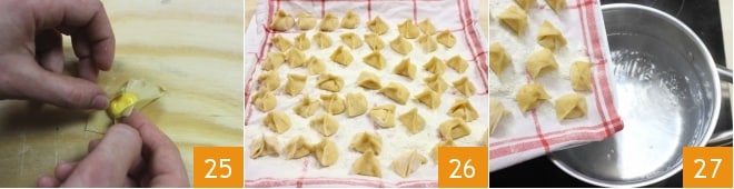 Procédez à la fermeture des pochettes pincées : joignez deux coins opposés de chaque carré 25, collez les côtés pour fermer la farce, puis joignez les deux côtés restants en les pinçant pour former une pochette. Recouvrez maintenant un plateau avec un torchon bien saupoudré de farine et transférez-y les pochettes que vous avez réalisées 26. Remplissez une grande casserole d'eau salée et portez à ébullition, puis versez les pochettes et faites cuire pendant quelques minutes 27.