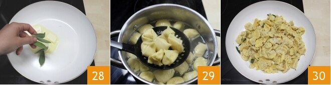 En attendant, faites fondre le beurre dans une poêle antiadhésive et ajoutez quelques feuilles de sauge 28. Quand les pochettes pincées remontent à la surface, égouttez-les avec une écumoire 29 et faites-les sauter à la poêle avec le beurre et la sauge. Assaisonnez-les avec du pecorino râpé et les pochettes pincées à la courge et pecorino de fossa sont prêtes à être servies et dégustées 30 !