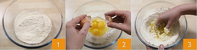 Pour préparer les pochettes pincées avec farce de courge et pecorino de fossa, commencez par réaliser la pâte aux œufs. Versez la farine 00 dans un grand bol 1, ou directement sur une planche farinée, ajoutez les œufs 2 et commencez à pétrir à la main 3.