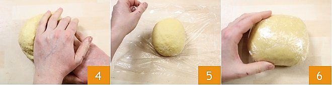 Transférez la pâte sur une planche farinée, si vous avez commencé à travailler la pâte dans un bol, et continuez à pétrir 4 jusqu'à obtenir une boule compacte 5. Recouvrez ensuite la boule d'un film plastique 6 et laissez reposer à température ambiante pendant 1 heure. Pour découvrir comment préparer au mieux la pâte aux œufs, consultez l'École de cuisine : pâte fraîche aux œufs (feuille et formats).