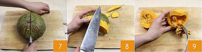 En attendant, occupez-vous de la courge : placez-la sur une planche à découper et coupez-la en deux 7. Ensuite, prenez une moitié, retirez la peau sur les côtés avec un couteau 8 et enlevez les graines internes à l'aide d'une cuillère 9.