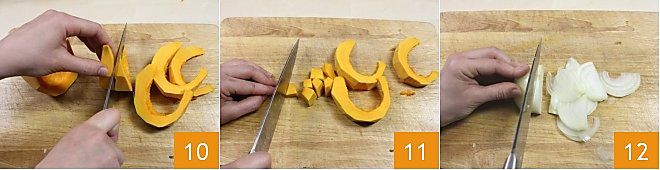 Ensuite, tranchez la moitié de la courge 10 et des tranches, découpez des petits dés 11. Prenez une demi-oignon, nettoyez-le et hachez-le finement 12.
