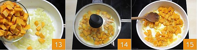 Versez un filet d'huile dans une poêle antiadhésive et faites rissoler l'oignon haché à feu doux. Quand l'oignon est bien doré, ajoutez les dés de courge 13. Couvrez avec un couvercle et faites cuire à feu doux pendant environ 30 minutes, en ajoutant de l'eau ou du bouillon si nécessaire 14. Laissez bien sécher les dés de courge, sinon en les mixant, ils libéreront trop d'eau 15.