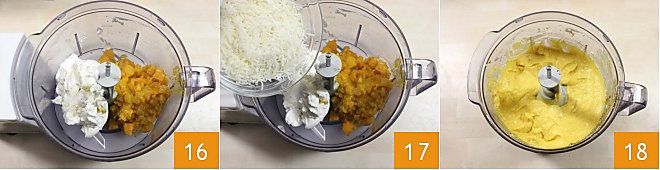 Une fois cuite, transférez la courge dans un mixeur avec la ricotta 16. Ajoutez également le pecorino de fossa que vous avez préalablement râpé 17 et ajustez le sel et le poivre à votre goût. Mixez le tout jusqu'à obtenir une crème homogène 18.